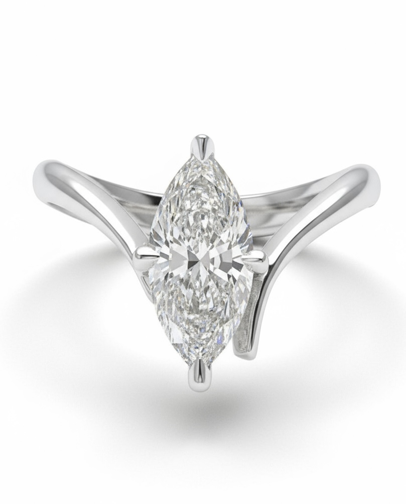 Un inel ce emană grație și rafinament în fiecare detaliu — acest model solitar pune în valoare un moissanite spectaculos cu tăietură Marquise, simbol al eleganței desavarsite. Piatra principală, disponibilă în variante de 1, 2 sau 3 carate, strălucește impecabil datorită culorii D și clarității VVS, oferind aceeași intensitate ca un diamant natural de cea mai înaltă calitate.