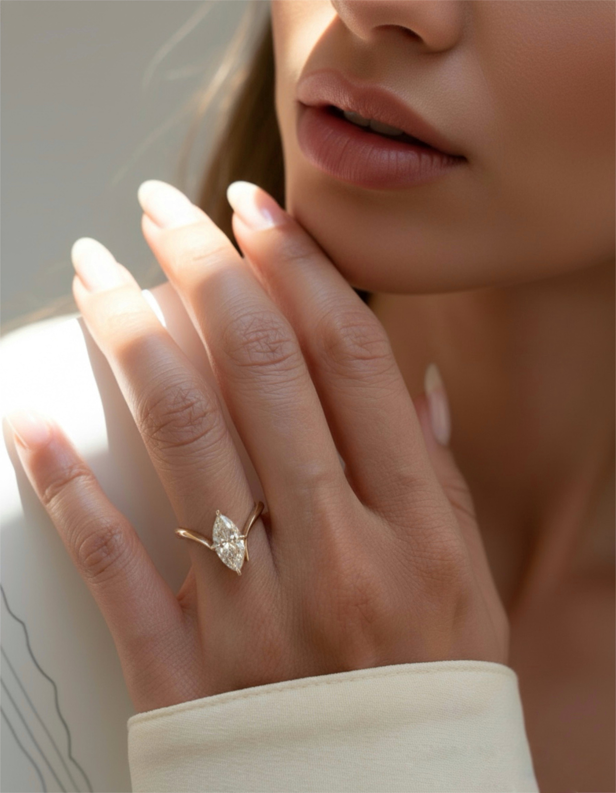 Inelul are o piatră de tip moissanite, tăietură Marquise, cu o strălucire comparabilă cu cea a diamantului natural.