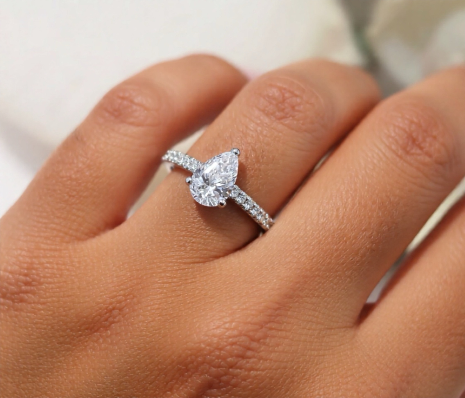 - Piatră centrală: Moissanite de 6x9 mm, 1.5 ct, tăietură pară