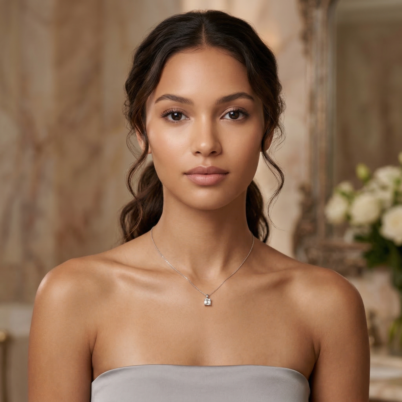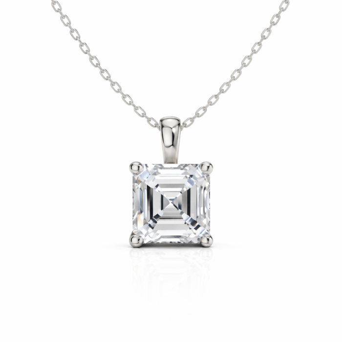Pandantivul este încrustat cu un moissanite de 1 carat, tăietură Asscher – una dintre cele mai spectaculoase și moderne forme, ce reflectă lumina cu o strălucire clara și armonioasă. Piatra are culoare D și claritate VVS, oferind un luciu excepțional, comparabil cu cel al diamantului.