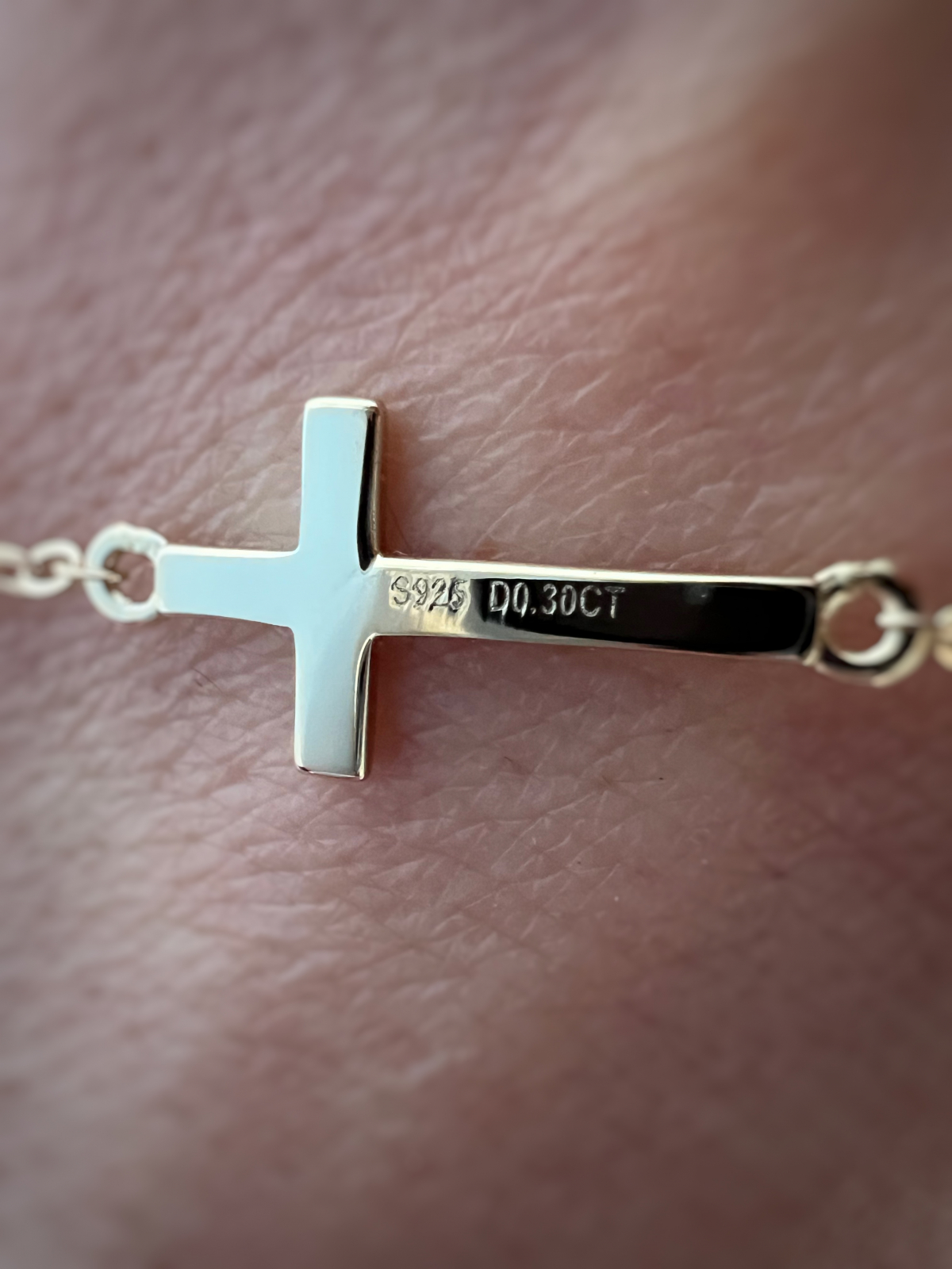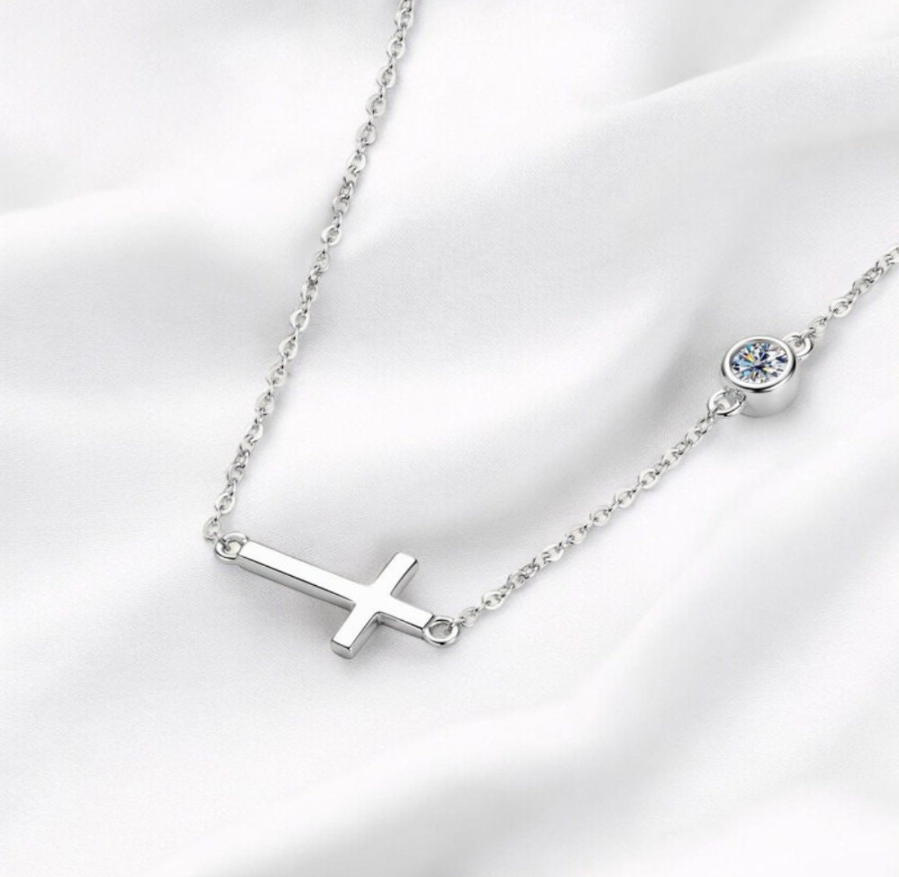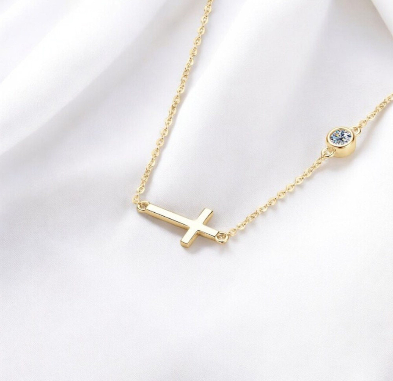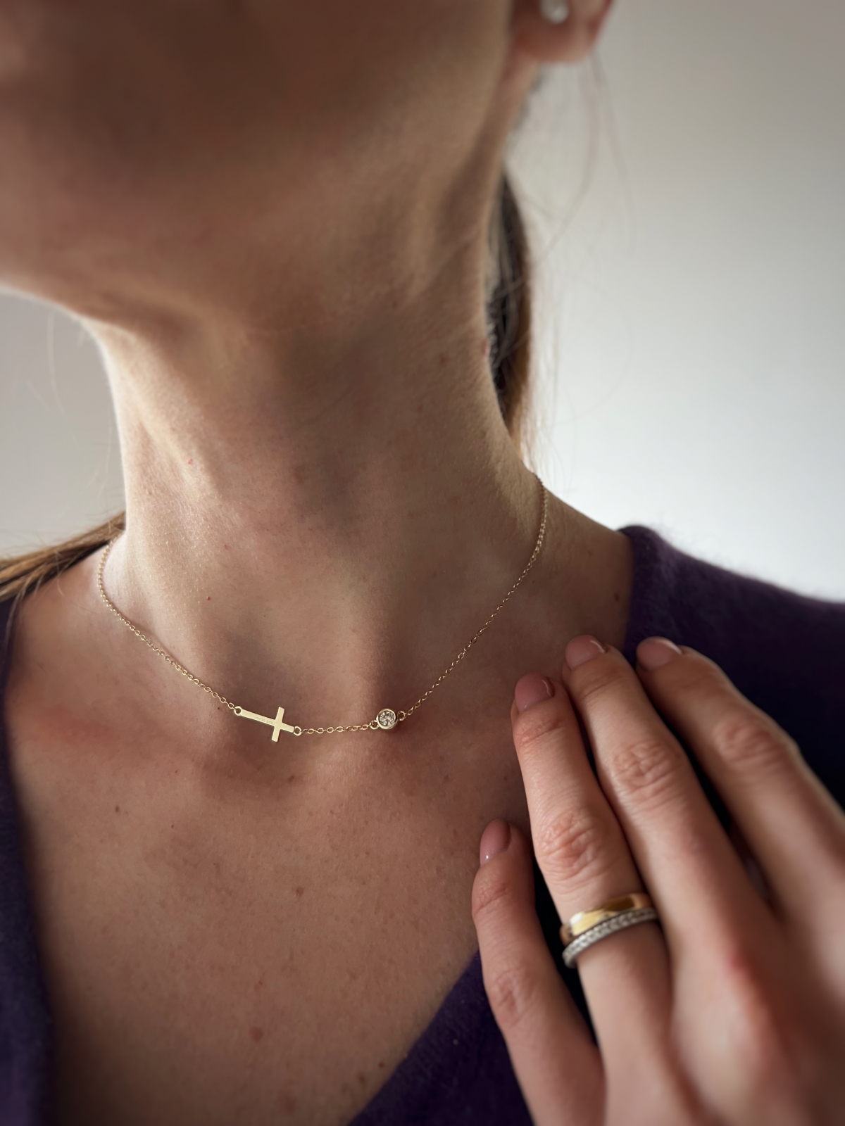 Acest lanț delicat cu pandantiv în formă de cruce este un accesoriu simbolic și sofisticat, perfect pentru a adăuga un strop de rafinament și semnificație ținutelor tale. Moissanitele de o frumusețe rară, cu strălucirea lor nemărginită, sunt perfecte pentru a înfrumuseța acest design sacru. Fie că îl porți pentru a adăuga un aer de eleganță discretă sau pentru a transmite un mesaj de credință și protecție, acest lanț îți va completa perfect stilul.