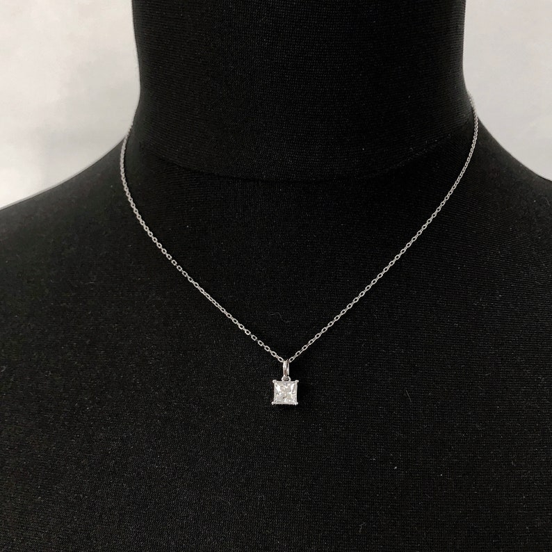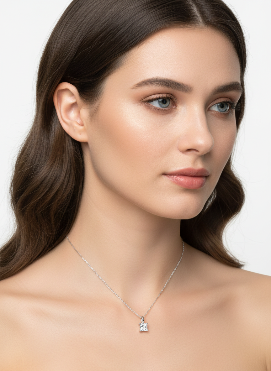 Pandantivul este încrustat cu un moissanite de 1 carat, tăietura princess – una dintre cele mai complexe si moderne forme, ce reflectă lumina cu o strălucire intensă și luxurianta. Piatra are culoare D și claritate VVS, oferind un luciu excepțional, comparabil cu cel al diamantului.