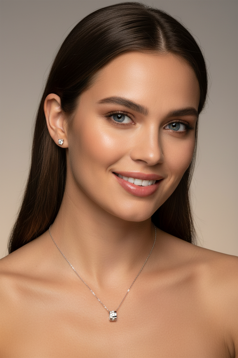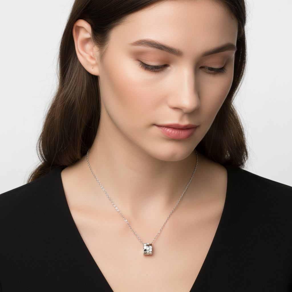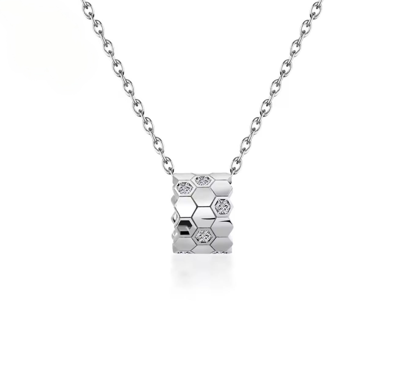 Un design modern, cu detalii geometrice elegante și o strălucire subtilă, acest lănțișor este perfect pentru a adăuga rafinament oricărei ținute. Pandantivul are formă cilindrică cu model hexagonal și este împodobit cu moissanite de înaltă calitate, pentru un look sofisticat și actual.