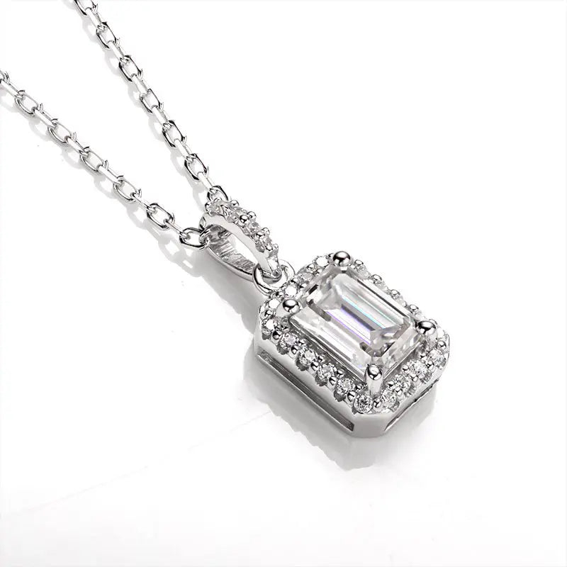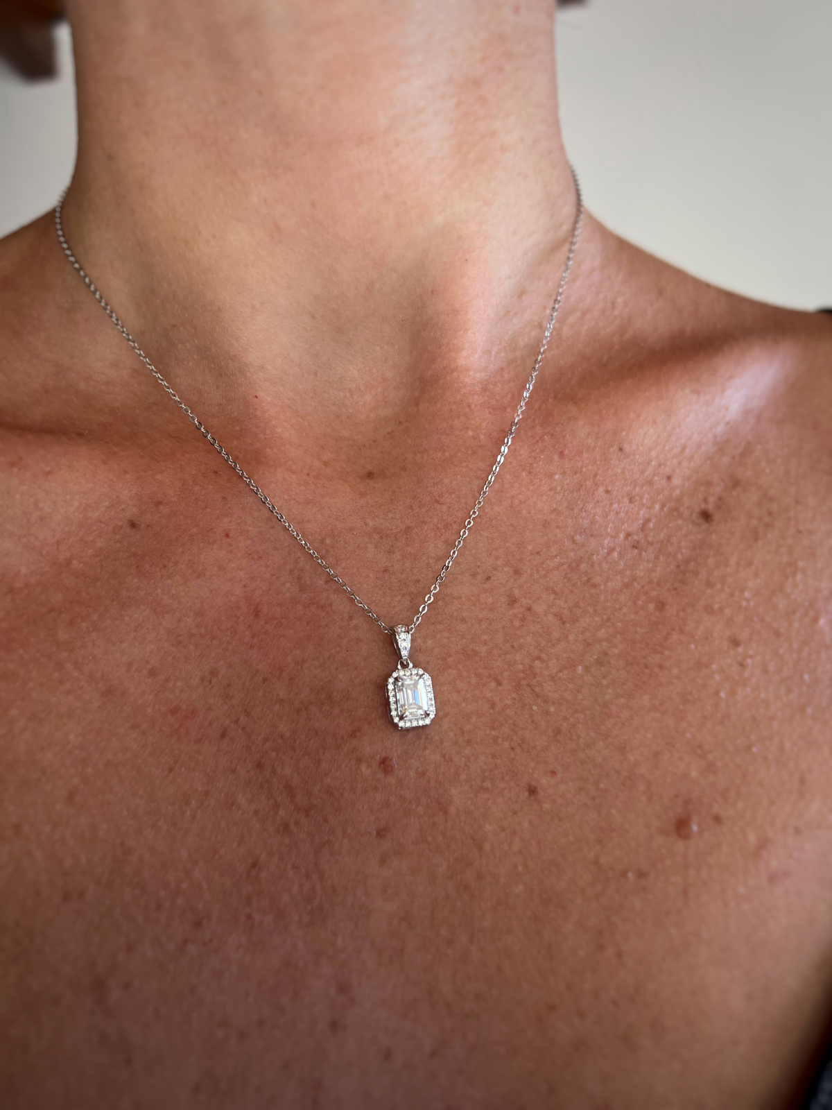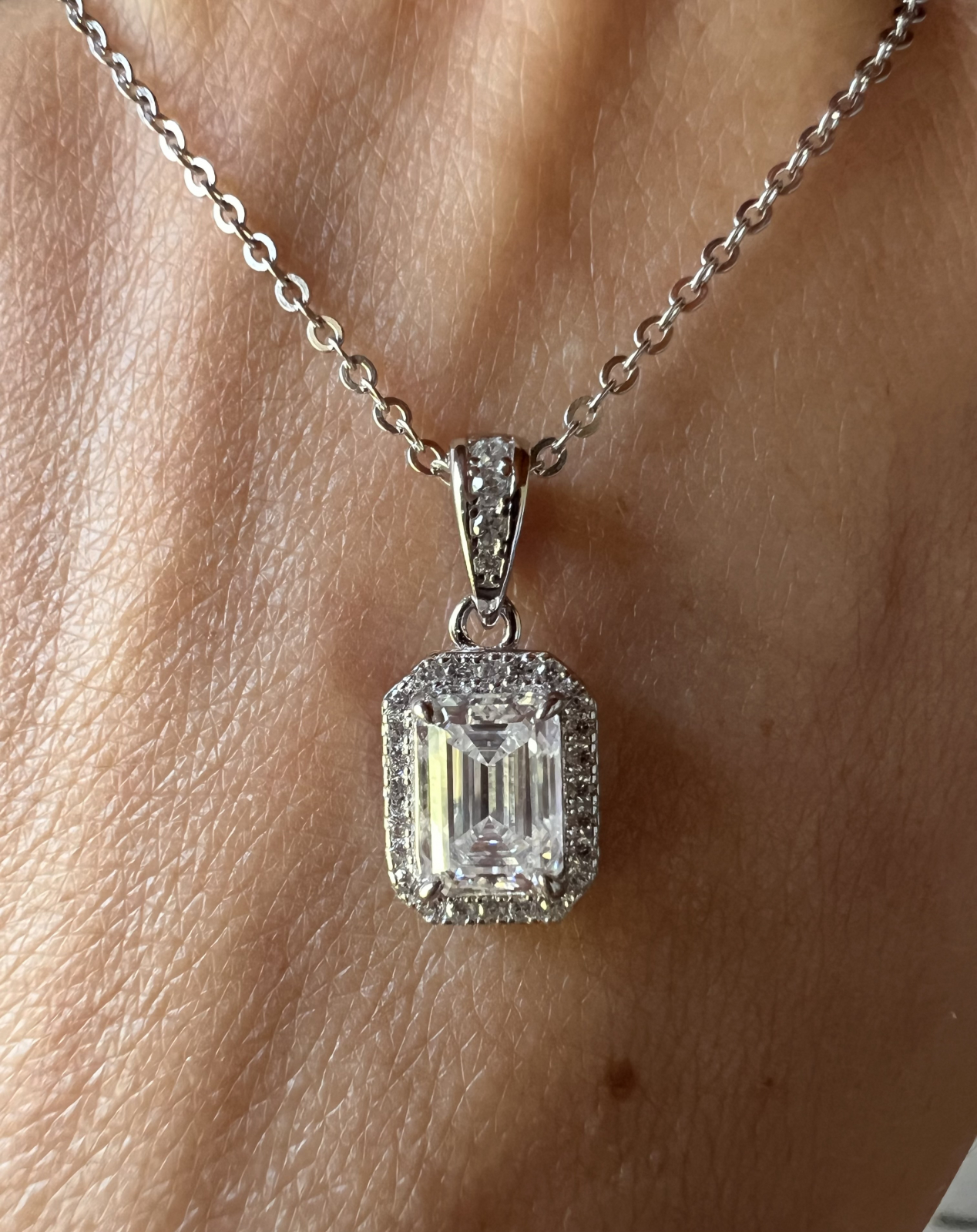 Acest lant cu pandantiv cucerește prin eleganța clasică și rafinamentul detaliilor. Realizat din argint 925 placat cu platină, oferă o strălucire luxoasă și discreta. Piatra centrală, un moissanit de 1 carat tăietură emerald, impresionează prin claritatea VVS și culoarea D – cele mai înalte standarde ale perfecțiunii optice. Halo-ul delicat care înconjoară piatra adaugă un plus de lumină și sofisticare.