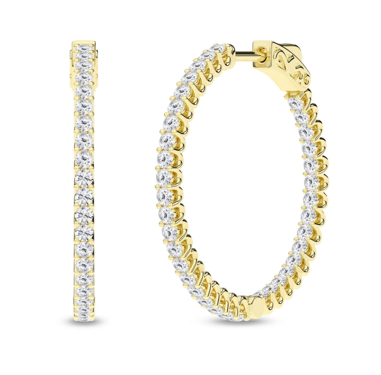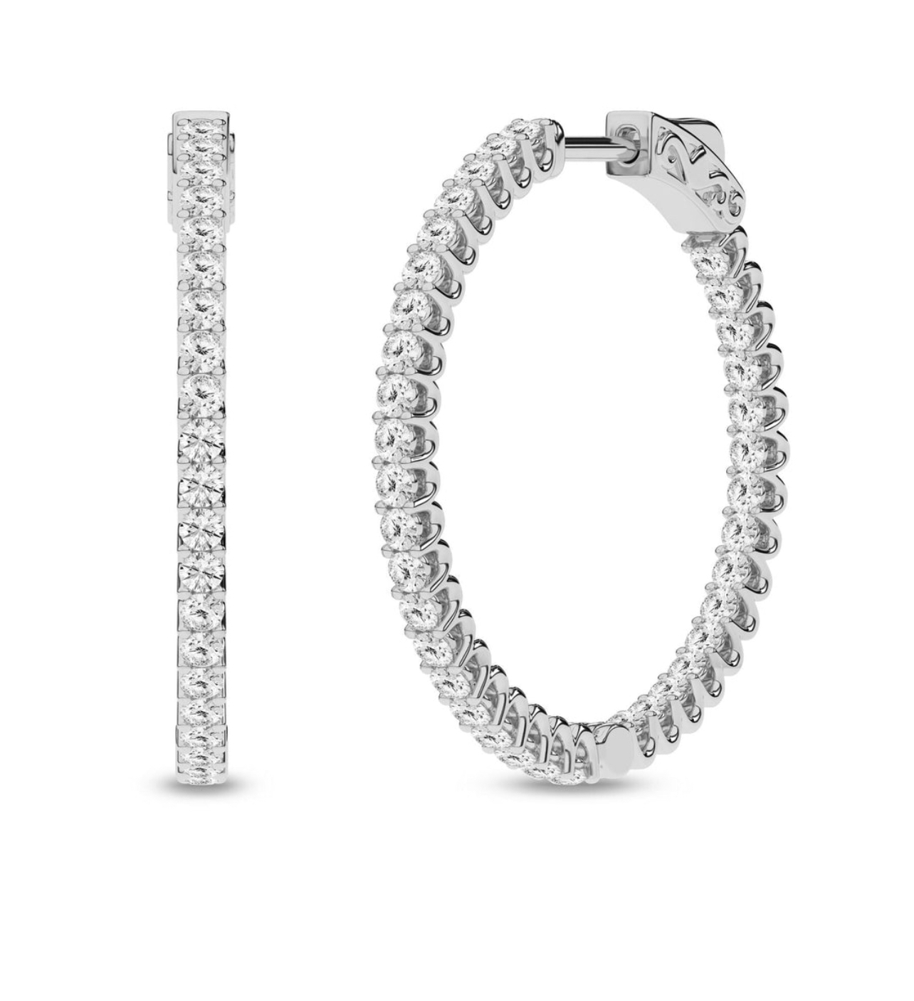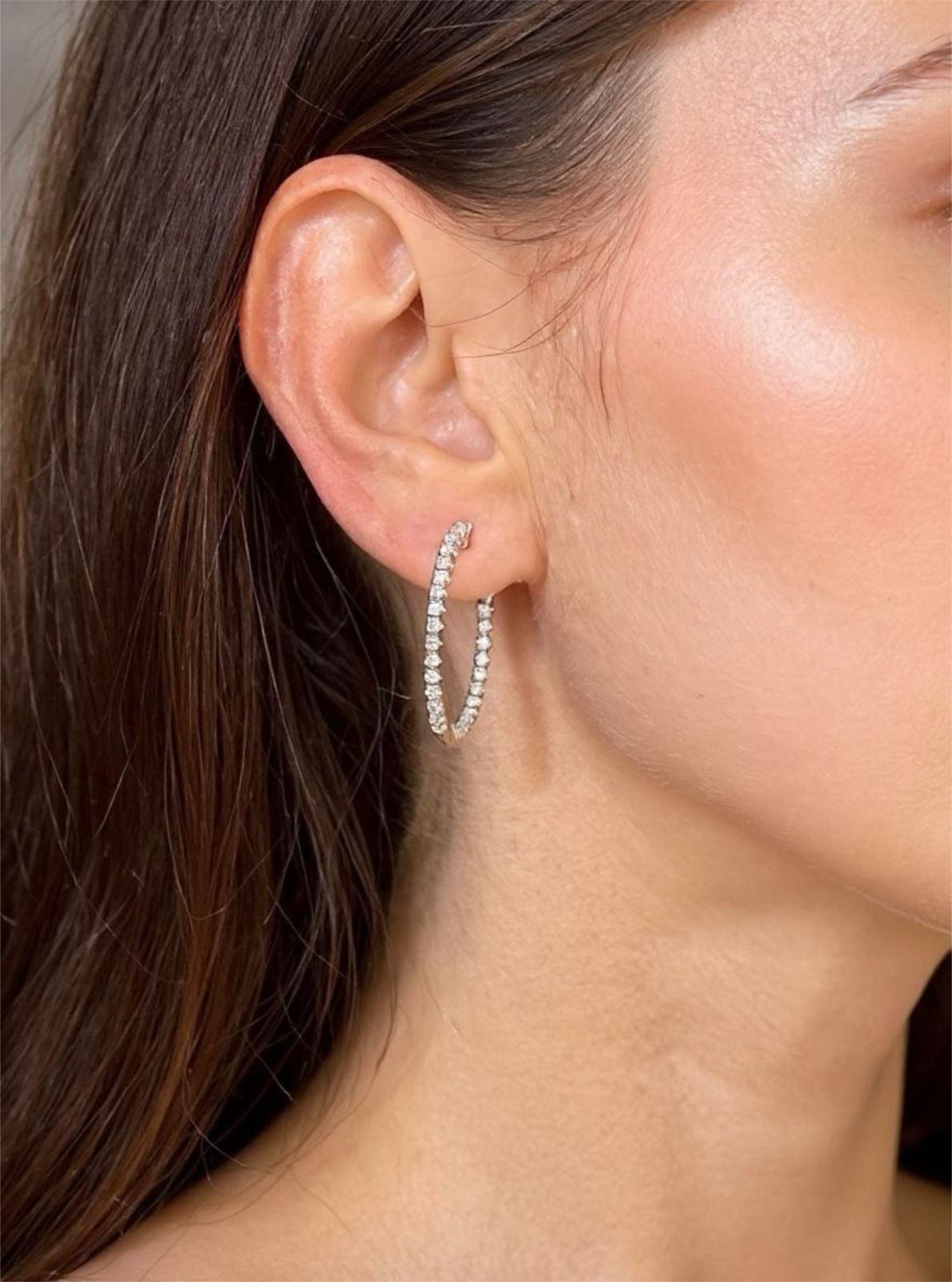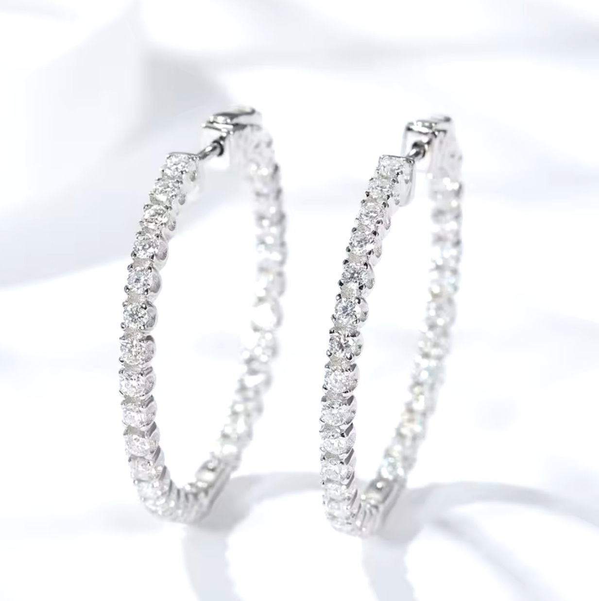 Acești cercei cu stralucirea radiantă sunt realizați din argint 925 și placați cu platina sau aur galben la alegere. Imbracati in 58 de moissanite de culoare D, claritate VVS1, acestia au un total de aprox. 1,5 carate ( 0,78 CT x 2).  Diametrul interior al cercelului este de 3 cm.