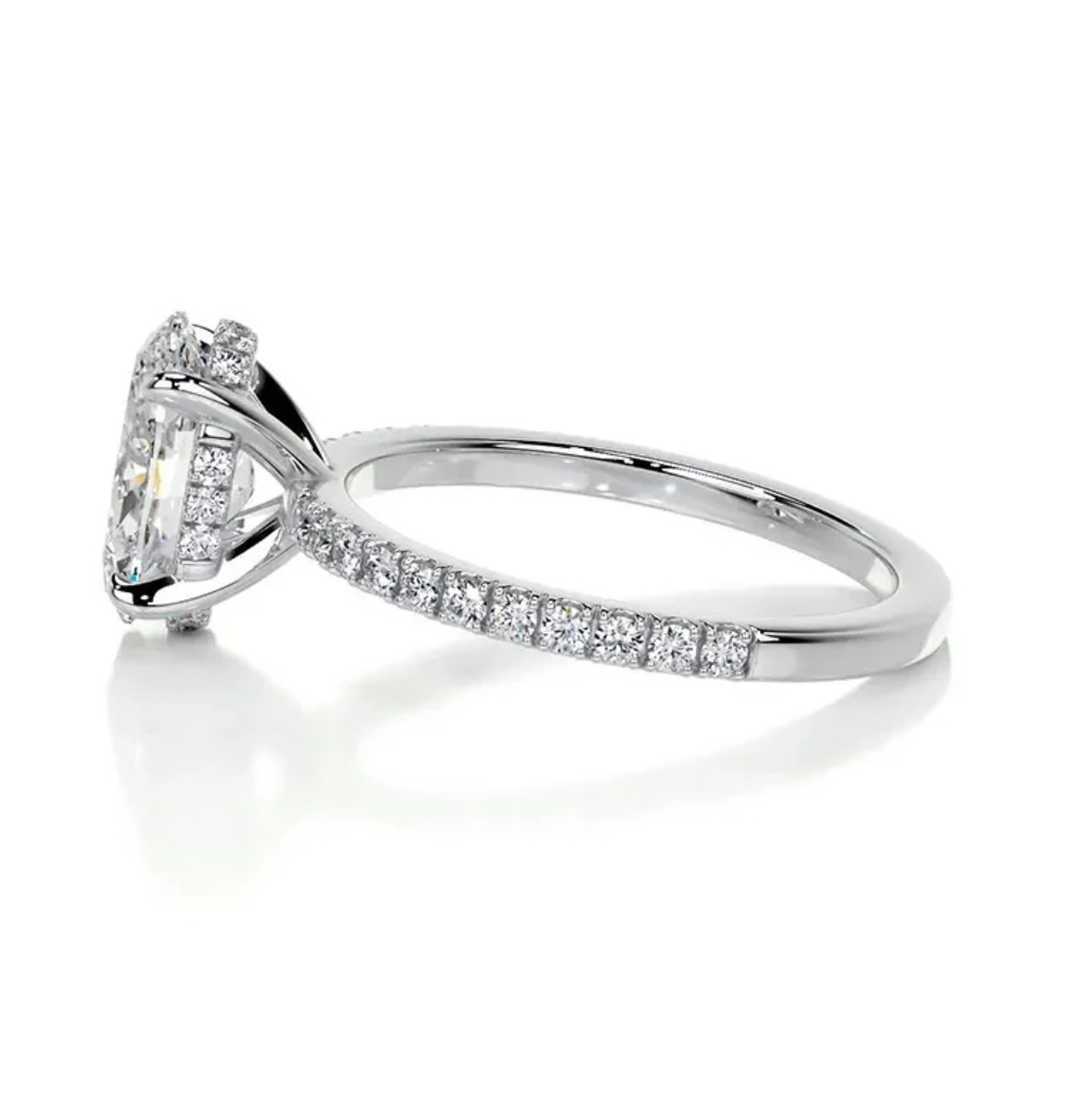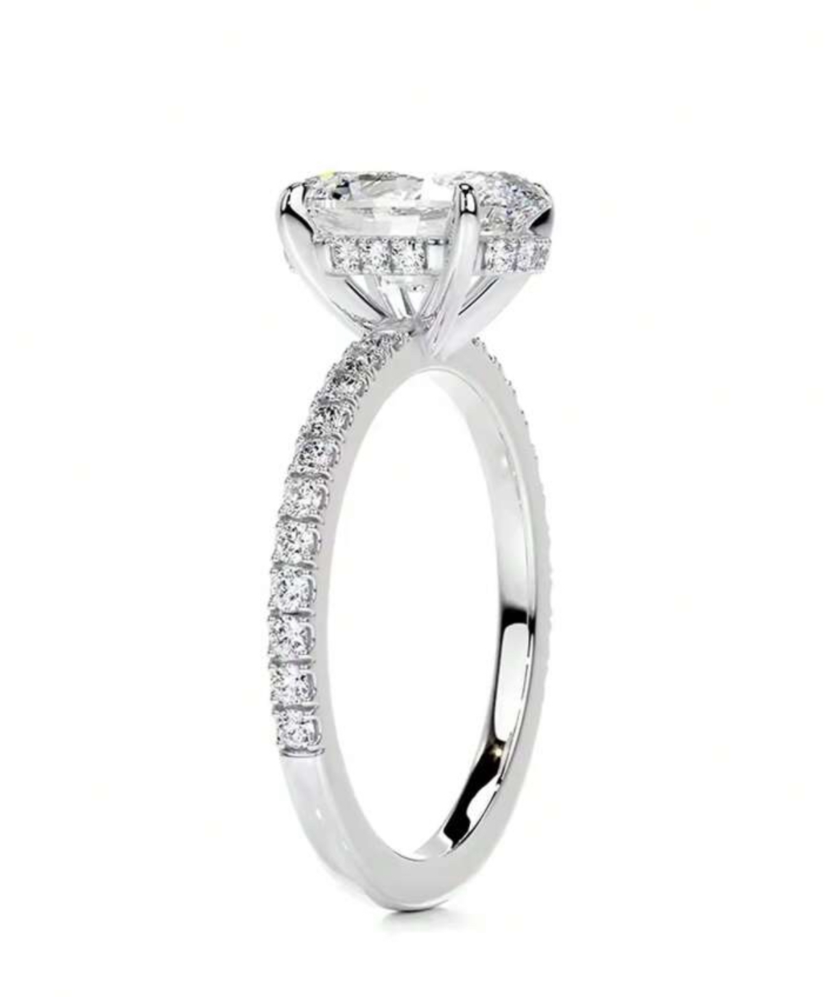Alegeti rafinamentul atemporal cu inelul de logodnă Moissanite „Classic Oval Elegance”. Acest inel rafinat are un moissanit uimitor de tăiere ovală de 7x9 mm, de 2 carate, renumit pentru strălucirea și focul său excepțional, care arată un grad de culoare D și claritate VVS, si moissanite de 1 mm pe halo-ul ascuns si laterale. Asezat cu expertiză într-un cadru clasic pe o bandă din aur de 10K, 14K, 18K sau platina, acest inel emană eleganță și grație, făcându-l simbolul perfect al iubirii eterne.