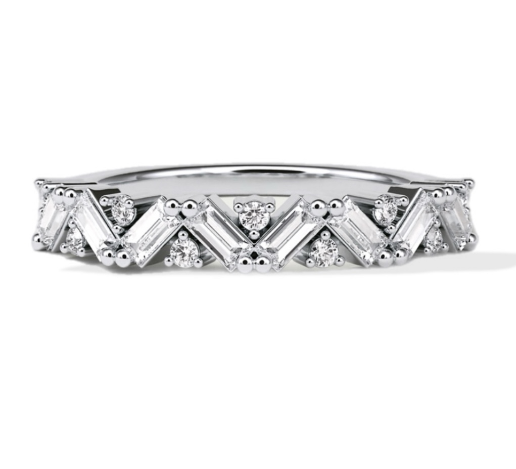 Strălucire arhitecturală și eleganță modernă – acest inel semieternity este o alegere rafinată pentru cele care iubesc detaliile geometrice, dar și finețea clasică. Realizat din aur (10K, 14K sau 18K) sau platină, inelul este decorat cu moissanite, tăieturi emerald și rotundă, montate într-un model dinamic tip zigzag ce reflectă lumina din toate unghiurile.