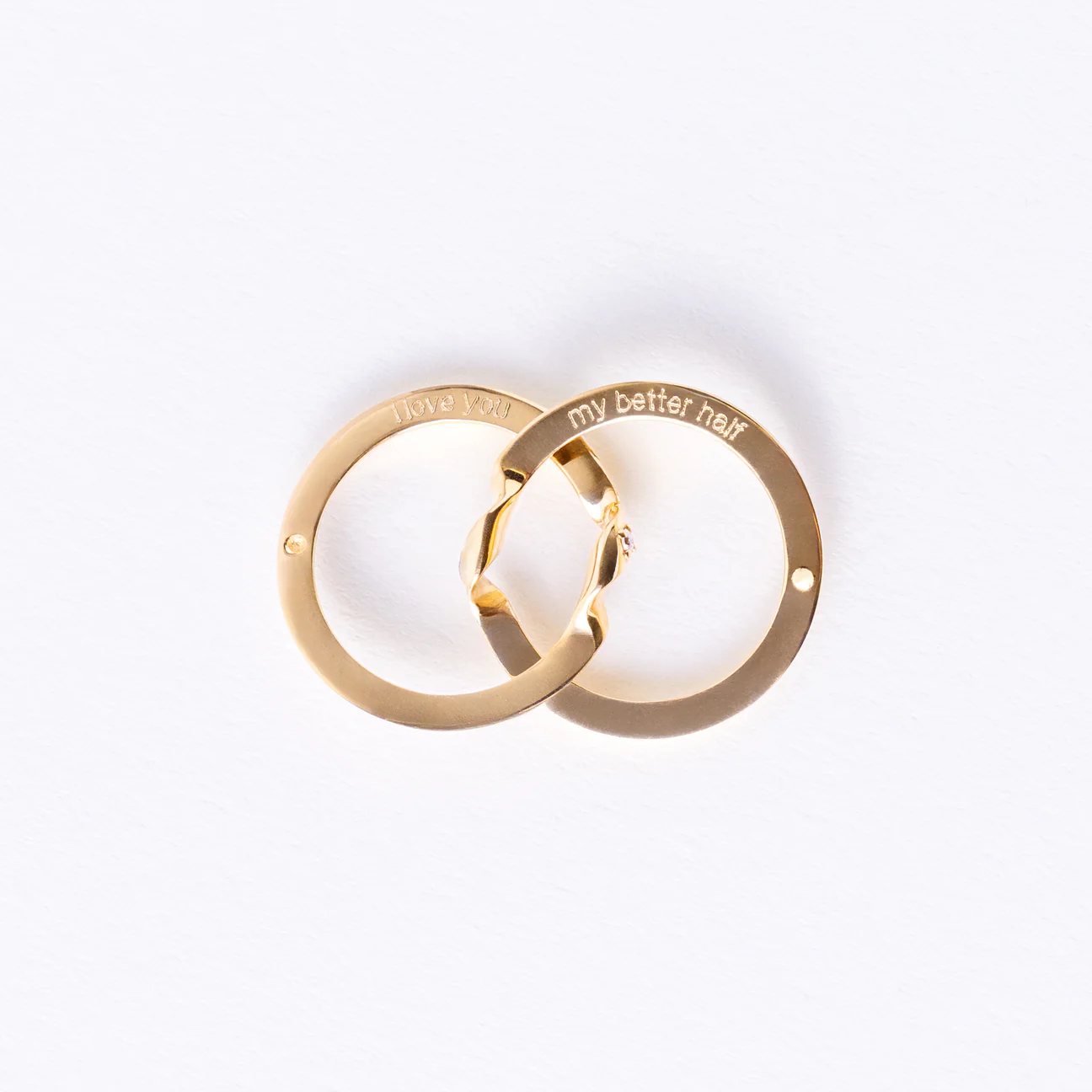 Un simbol rar al legăturii autentice — acest inel de tip Gimmel este format din două jumătăți perfect unite, fiecare având o lățime de 1,5 mm, pentru un total delicat de 3 mm. Fiecare jumătate este decorată cu un moissanit rotund, culoare D, claritate VVS — o piatră prețioasă care reflectă puritate și strălucire fără compromisuri.