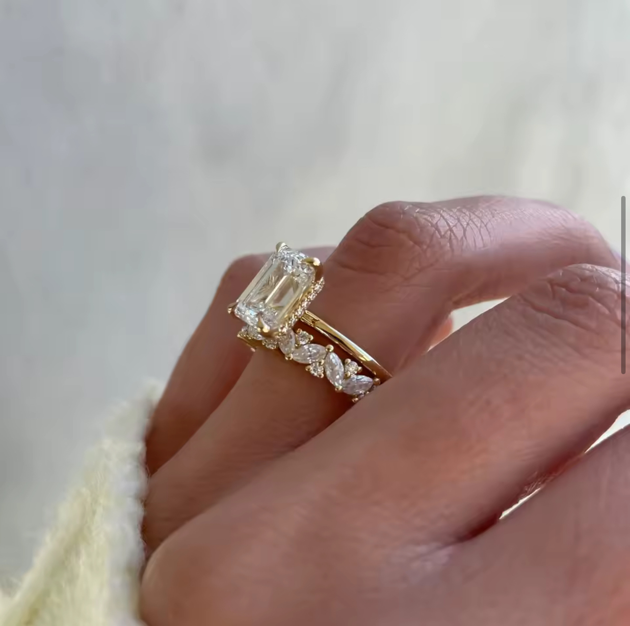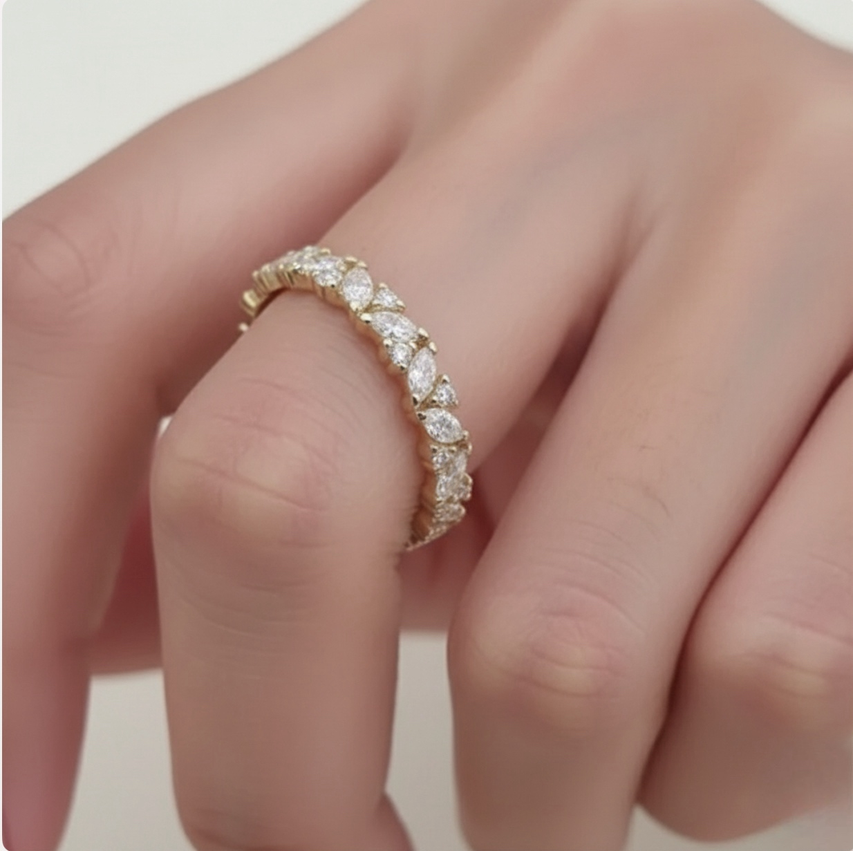 Descoperă rafinamentul suprem cu acest inel din aur de 9K, 14K sau 18K, perfect conceput pentru a evidenția strălucirea și eleganța moissanitelor de culoare D și claritate VVS. Aceste pietre prețioase sunt tăiate cu măiestrie în forme marquise și round, oferind un joc de lumini captivant ce îți va atrage privirile din orice unghi. Inelul are aproximativ 1 carat.