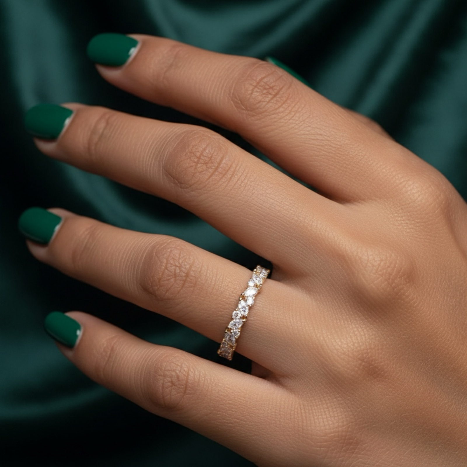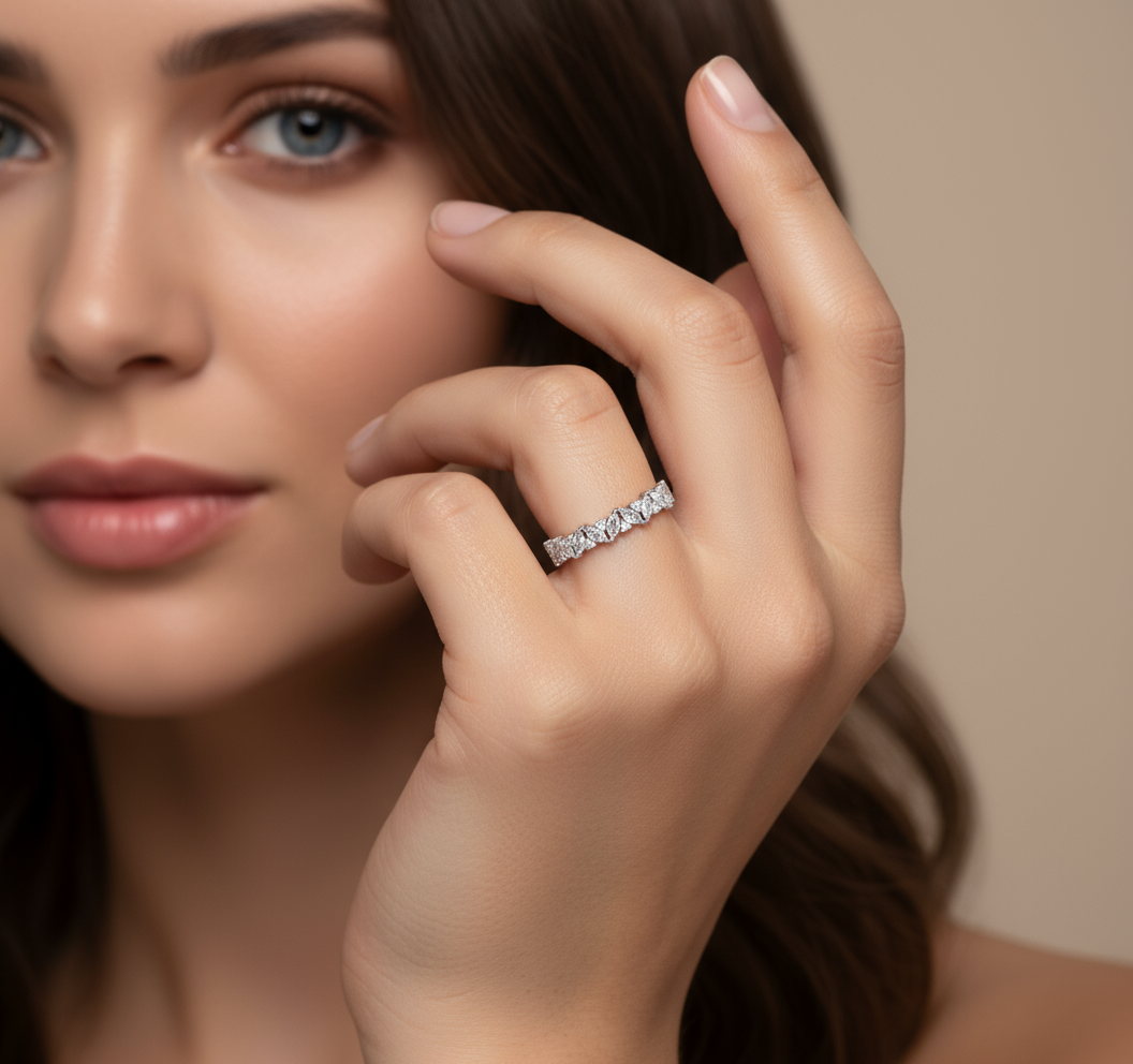 Culoarea D este cea mai pură și rară nuanță disponibilă, iar claritatea VVS asigură un aspect impecabil, fără nicio incluziune vizibilă cu ochiul liber. Fiecare moissanite reflectă lumina cu o intensitate deosebită, oferind inelului un aer sofisticat și modern.